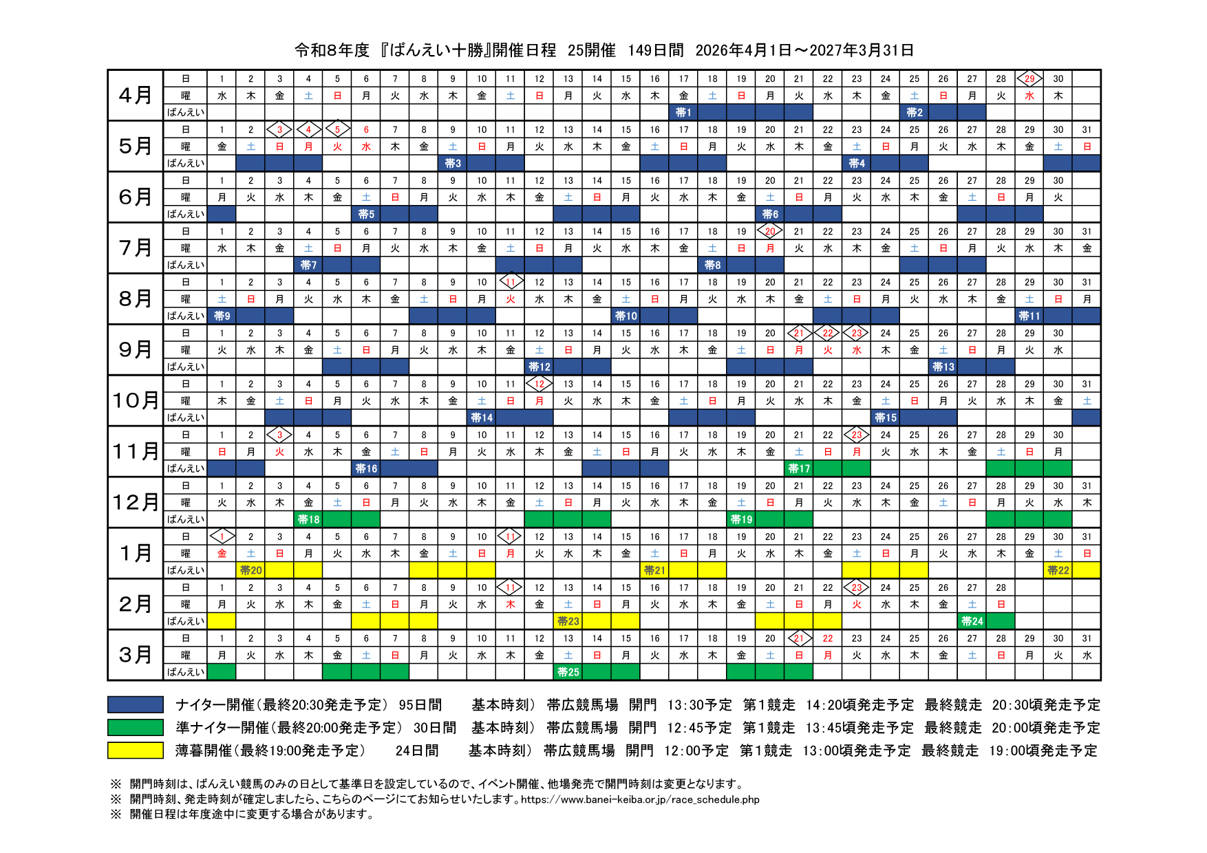 | ばんえい開催 | 帯広競馬場 開門 09:20 第1R 13:05 第12R 19:05 |